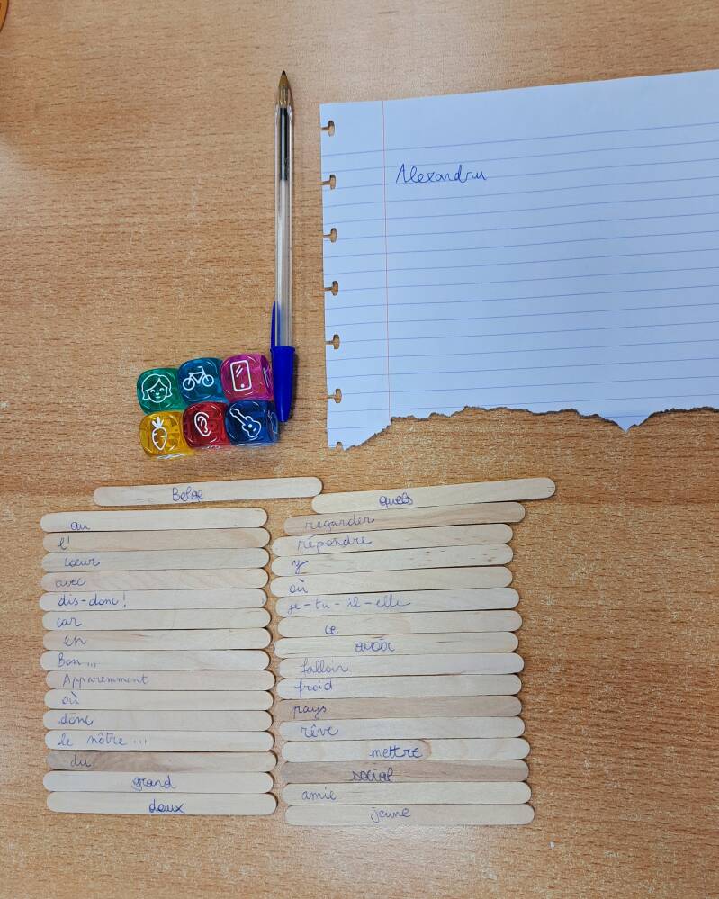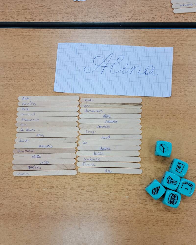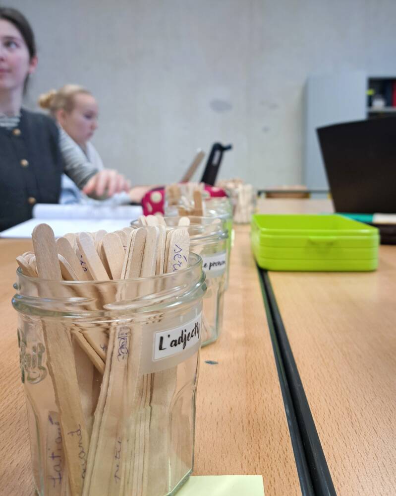 Ils ont d'abord étudié la théorie, puis l'ont mise en pratique dans leur manuel numérique. Ensuite, ils se sont mis au travail avec ... des bâtonnets de glace. Ils ont placé des centaines de bâtonnets dans le bon bocal en fonction du type de mot. Ils ont ensuite dû corriger leurs erreurs eux-mêmes à l'aide de ChatGPT, qui leur a réexpliqué la théorie et l'a illustrée à l'aide d'une phrase d'exemple. Ils ont ensuite dû prendre un certain nombre de bâtonnets. À l'aide de tous ces mots et d'images issues de leurs dés à histoires, ils vont maintenant rédiger un récit créatif. Plus tard, nous utiliserons ces récits pour évaluer la matière.